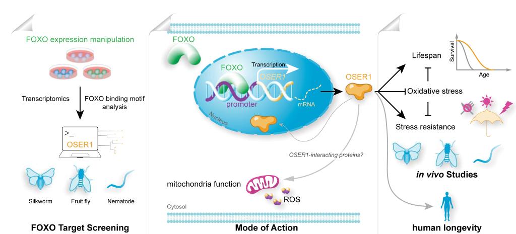 為了闡釋OSER1調(diào)節(jié)長壽的作用機制,研究團隊在家蠶、線蟲和果蠅中進行了一系列的分子生物學(xué)實驗。研究結(jié)果共同表明,OSER1是叉頭框蛋白O的直接靶基因,OSER1能夠響應(yīng)過氧化氫誘導(dǎo)的氧化應(yīng)激,并通過提升機體氧化應(yīng)激防御力發(fā)揮延長壽命的作用。