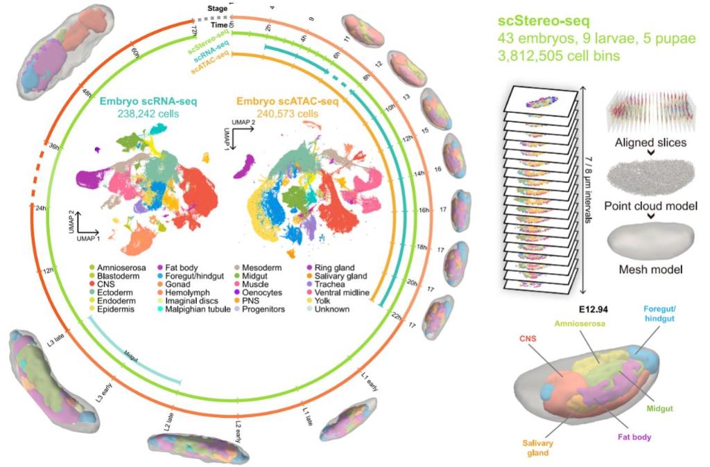 杭州華大生命科學研究院與南方科技大學創(chuàng)建了一個解碼動物發(fā)育過程的多模態(tài)數(shù)據(jù)集,生成了果蠅全發(fā)育周期的3D單細胞時空多組學圖譜,為生物發(fā)育提供了分子層面的參考,有望為發(fā)育缺陷及相關疾病機制研究奠定基礎。相關成果26日發(fā)表于國際學術期刊《細胞》。 研究人員介紹,動物發(fā)育是基因與細胞在時空維度上精密協(xié)作的復雜過程。以果蠅為例,其發(fā)育的過程,大體需要經過卵、幼蟲、蛹和成蟲4個階段。如果說這個成長過程,是一場精密編排的“生命舞臺劇”,那么每個細胞何時何地“登場”、如何變成特定的細胞類型,便都是由基因“劇本”調控的。