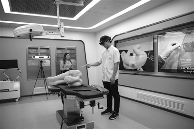 在位于安徽省蕪湖市的“中國視谷”,工作人員在模擬手術(shù)室里演示數(shù)字化手術(shù)輔助平臺(tái)。新華社發(fā)(肖本祥 攝)