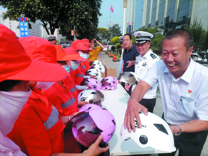 今年是我市創(chuàng)建全國文明城市的決戰(zhàn)決勝年,廣大環(huán)衛(wèi)工人一直默默奮斗在崗位上,為我市創(chuàng)文不斷努力。市公安局交警支隊始終牽掛著奮戰(zhàn)在基層一線的環(huán)衛(wèi)工人,支隊以此次贈送頭盔活動為契機,持續(xù)關心關愛環(huán)衛(wèi)工人的生命安全和身體健康。市公安局交警支隊負責人表示:“環(huán)衛(wèi)工人大多騎著電動三輪車或人力保潔車穿梭在大街小巷,機動車道是他們的主要作業(yè)區(qū)之一,佩戴安全頭盔,可以大大增加他們的安全系數(shù)。同時,環(huán)衛(wèi)等重點行業(yè)的示范引領作用,將有力帶動市民遵紀守法、安全出行,為文明城市創(chuàng)建打造一道亮麗的風景線。”圖為捐贈活動現(xiàn)場。張志遠 攝影報道