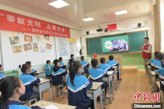 在國(guó)家電網(wǎng)“電力愛心教室”內(nèi),電力人員為鄉(xiāng)村兒童科普電力知識(shí)。展望攝