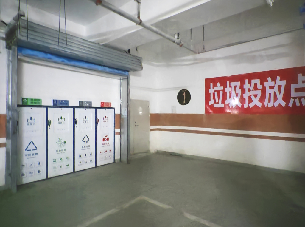 樹華園小區(qū)里沒有地面垃圾桶,只在一些日常人流密集區(qū)域設(shè)置有果皮箱和垃圾回收機(jī)。小區(qū)共有36棟住宅樓,按照每三到五棟樓為一個(gè)組團(tuán),在地下停車場集中設(shè)置了垃圾分類投放點(diǎn)。