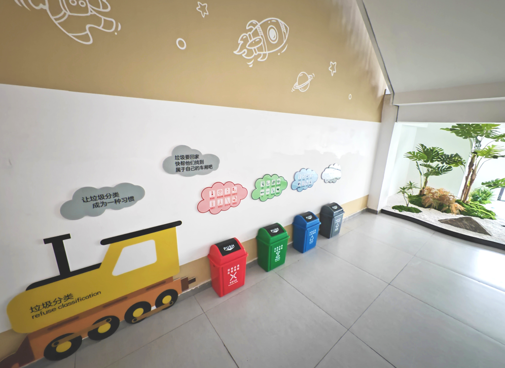 3月28日,悅?cè)菪W(xué)教學(xué)樓內(nèi)的垃圾分類箱。新華社記者楊帆攝