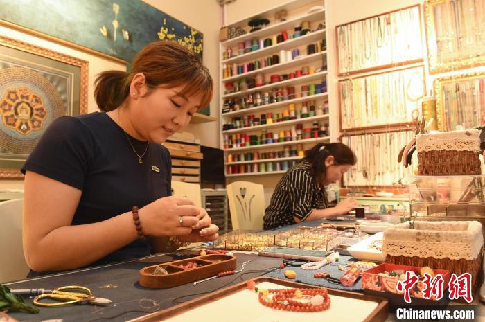 6月12日,在山東煙臺一家飾品店,編織師傅忙著編織腕飾。曲正揚 攝