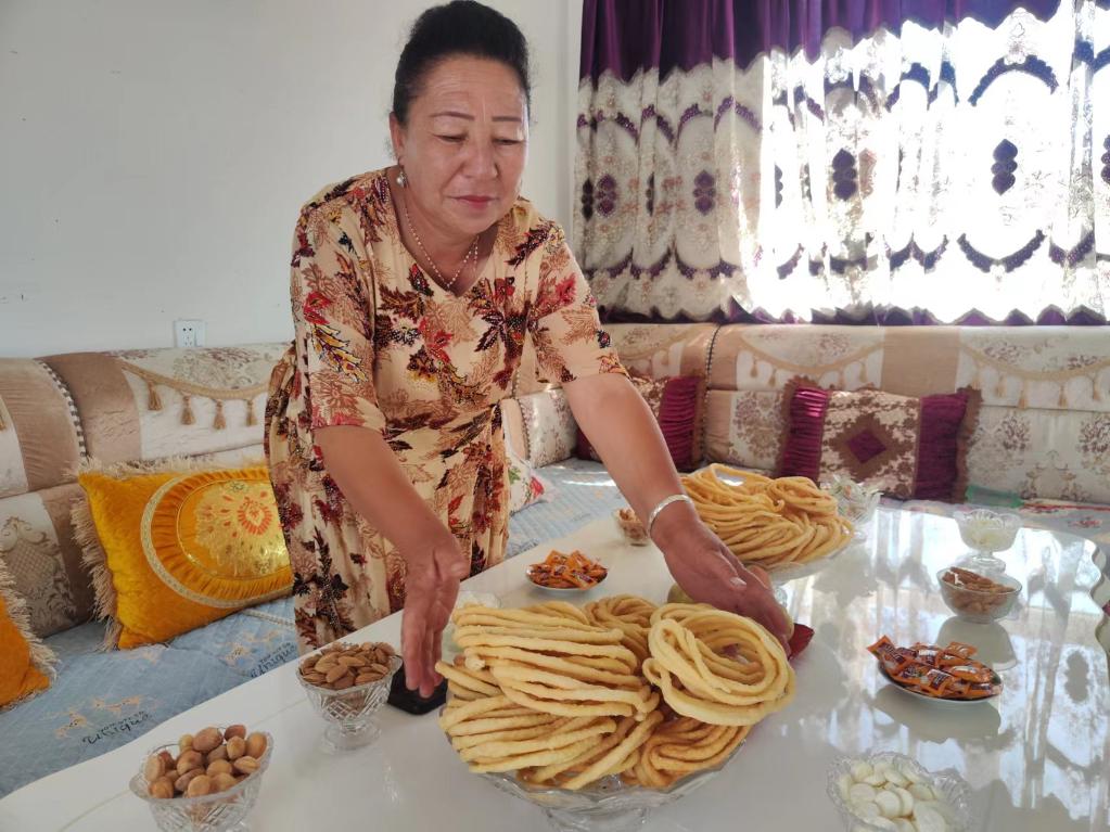 6月30日,烏什縣亞曼蘇柯爾克孜族鄉(xiāng)尤勒吐孜布拉克村居民阿曼古麗·熱合曼正在新居里準(zhǔn)備茶點。新華社記者 關(guān)俏俏 攝