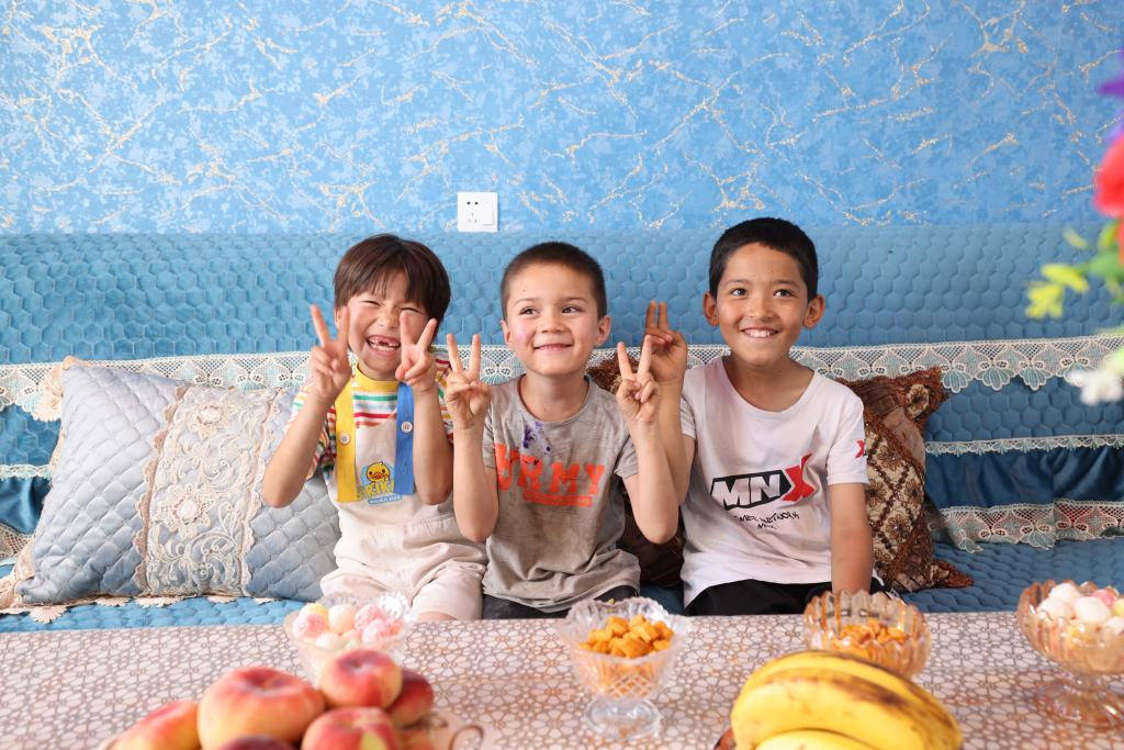 6月30日,在烏什縣亞曼蘇柯爾克孜族鄉(xiāng)幸福新區(qū),小朋友們在新家玩耍。新華社發(fā)(楊碩 攝)