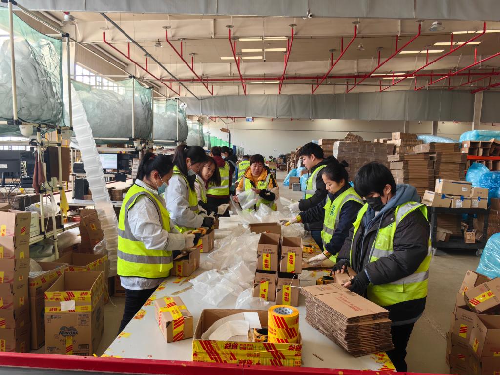 1月22日,在位于山東煙臺的日韓消費(fèi)品跨境電商中心京東綜合倉內(nèi),工作人員將貨物分揀、打包。新華社記者 邵琨 攝