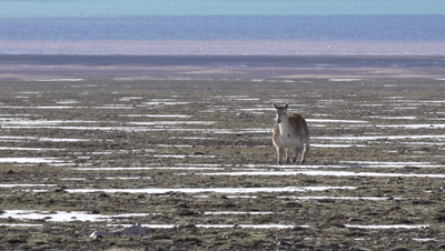正在埋頭吃草的藏羚羊顯然對(duì)這只新來(lái)的“伙伴”充滿了好奇,紛紛停止覓食,抬起頭來(lái),打量著這個(gè)有點(diǎn)不一樣的“新人”。很明顯,機(jī)警膽小的藏羚羊只是有點(diǎn)好奇,“新人”的“妝感”并沒(méi)有把它們嚇跑。終于,這只有點(diǎn)特殊的“藏羚羊”成功入群,成為卓乃湖畔成千上萬(wàn)只藏羚羊中的一員。