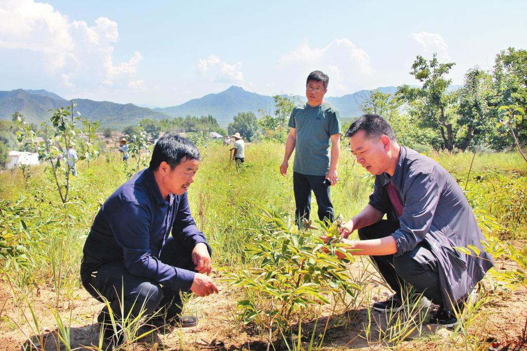 深秋季節(jié),由山西交控集團(tuán)駐五臺(tái)縣東雷鄉(xiāng)孟家坪村扶貧工作隊(duì)幫扶種植的480畝油用牡丹還在茁壯生長。41戶入社脫貧戶依靠五臺(tái)農(nóng)商銀行金融扶貧的優(yōu)惠政策投資種植。到5年收獲期,年可創(chuàng)產(chǎn)值96萬元,戶均收入2.3萬元。圖為工作隊(duì)員在察看油用牡丹長勢。 俊賢 先良 攝