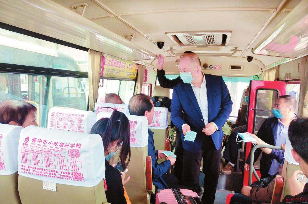原平市交通運(yùn)輸局加強(qiáng)對交通運(yùn)輸企業(yè)、“兩客一危一貨”、旅游包車、網(wǎng)絡(luò)包車和重點(diǎn)路段的監(jiān)督檢查,嚴(yán)厲打擊“三超一疲勞”、非法載客、超員超限、疲勞駕駛和違規(guī)冒險行車等違法違規(guī)行為。在抓安全的同時,將疫情防控常態(tài)化,強(qiáng)調(diào)汽車站工作人員必須做好登記工作,督促乘客佩戴口罩。圖為工作人員在客車上為旅客發(fā)放口罩。( 劉建春 攝)