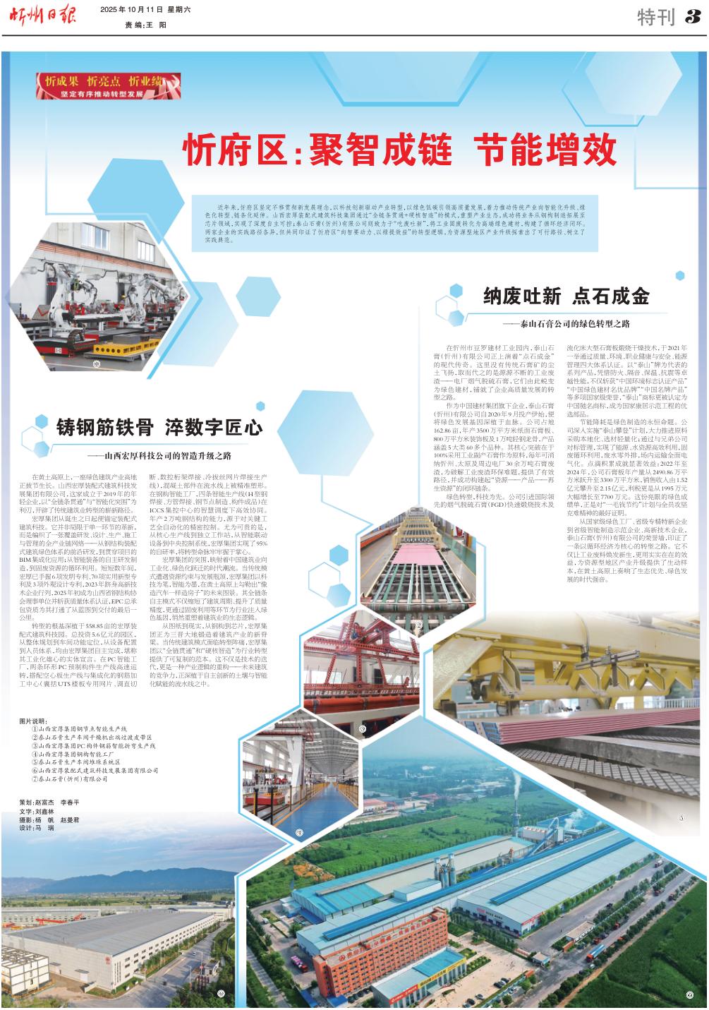 近年來,忻府區(qū)堅定不移貫徹新發(fā)展理念,以科技創(chuàng)新驅動產業(yè)轉型,以綠色低碳引領高質量發(fā)展,著力推動傳統(tǒng)產業(yè)向智能化升級、綠色化轉型、鏈條化延伸。山西宏厚裝配式建筑科技集團通過“全鏈條貫通+硬核智造”的模式,重塑產業(yè)生態(tài),成功將業(yè)務從鋼構制造拓展至芯片領域,實現(xiàn)了深度自主可控;泰山石膏(忻州)有限公司則致力于“吃廢吐新”,將工業(yè)固廢轉化為高端綠色建材,構建了循環(huán)經(jīng)濟閉環(huán)。兩家企業(yè)的實踐路徑各異,但共同印證了忻府區(qū)“向智要動力、以綠提效益”的轉型邏輯,為資源型地區(qū)產業(yè)升級探索出了可行路徑、樹立了實踐典范。