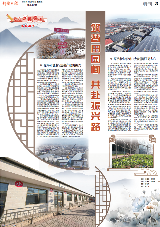 “夏賞荷,秋摘蓮,冬收藕,我們將依托交通優(yōu)勢規(guī)劃建設(shè)觀賞蓮藕園、垂釣魚稻園,讓游客留得住、玩得好,打造鄉(xiāng)村新經(jīng)濟?!彪S行的原平市吉祥街道辦事處副主任賈奕翔興致勃勃地談著新規(guī)劃,“再建設(shè)1000平方米的藕粉加工車間,走加工增值的路子;同時拓建沿滹旅游大道,讓張村成為鄉(xiāng)村游的熱門‘打卡地’?!?/p>
