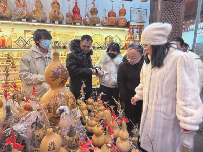 在吆喝聲此起彼伏的年貨市集,醒獅帽、剪紙、提燈等頗具年味的商品擺滿攤位,讓游客目不暇接,尤其是精美的葫蘆烙畫、面塑、扎染等非遺,既有傳統(tǒng)文化的風(fēng)韻,又融入現(xiàn)代設(shè)計(jì)巧思。