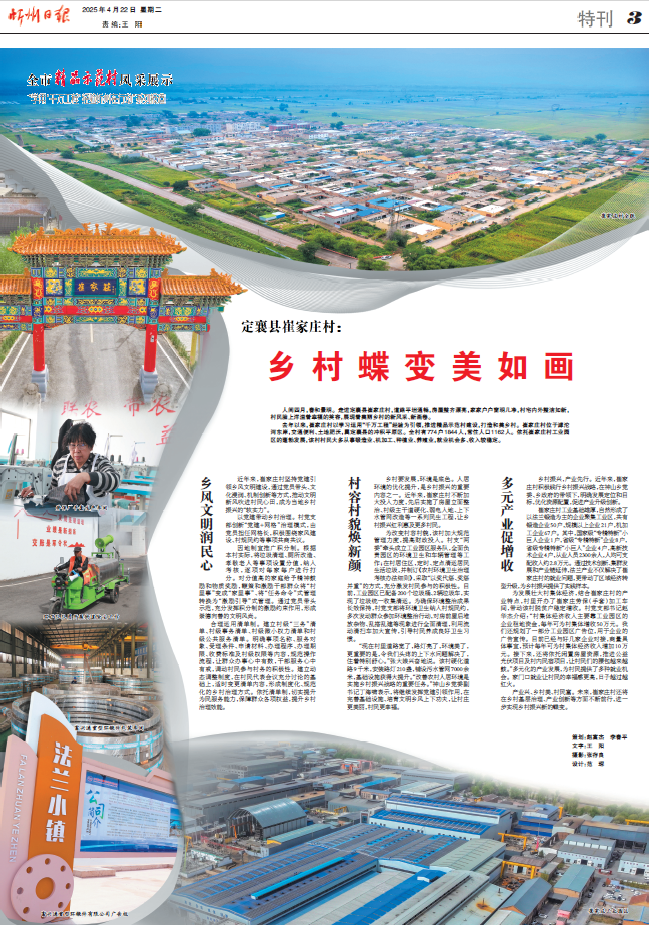 崔家莊村工業(yè)基礎(chǔ)雄厚,自然形成了以法蘭鍛造為主的企業(yè)聚集工業(yè)區(qū),共有鍛造企業(yè)50戶,規(guī)模以上企業(yè)21戶,機(jī)加工企業(yè)67戶。其中,國(guó)家級(jí)“專精特新”小巨人企業(yè)1戶,省級(jí)“專精特新”企業(yè)8戶,省級(jí)專精特新“小巨人”企業(yè)4戶,高新技術(shù)企業(yè)4戶,從業(yè)人員2300余人,人均可支配收入約2.8萬(wàn)元。通過技術(shù)創(chuàng)新、集群發(fā)展和產(chǎn)業(yè)鏈延伸,法蘭產(chǎn)業(yè)不僅解決了崔家莊村的就業(yè)問題,更帶動(dòng)了區(qū)域經(jīng)濟(jì)轉(zhuǎn)型升級(jí),為鄉(xiāng)村振興提供了實(shí)踐樣本。