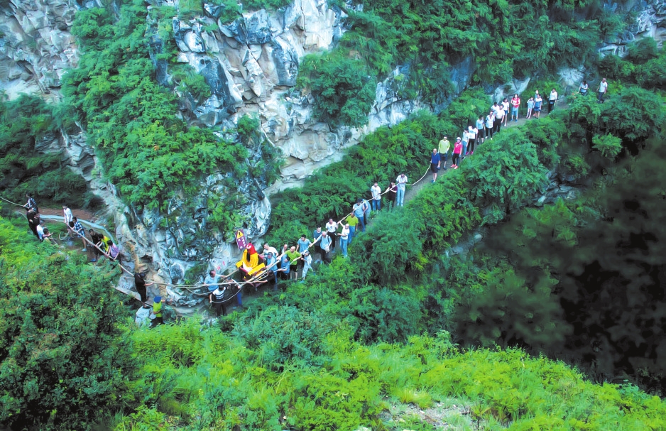 上山的路越來越難走,也越來越危險。前方是峭壁,只容一人通過,腳下便是萬丈深淵,一旦失足,后果難料。女士們有點(diǎn)害怕。朱部長一邊鼓勵,一邊教她們要領(lǐng):踩實(shí)、抓穩(wěn)、不要向下看。前面幾位戰(zhàn)戰(zhàn)兢兢相繼通過,最后一位女士微胖,滿臉汗珠,雙腿打顫,人們都為她捏了一把汗,好在有驚無險。