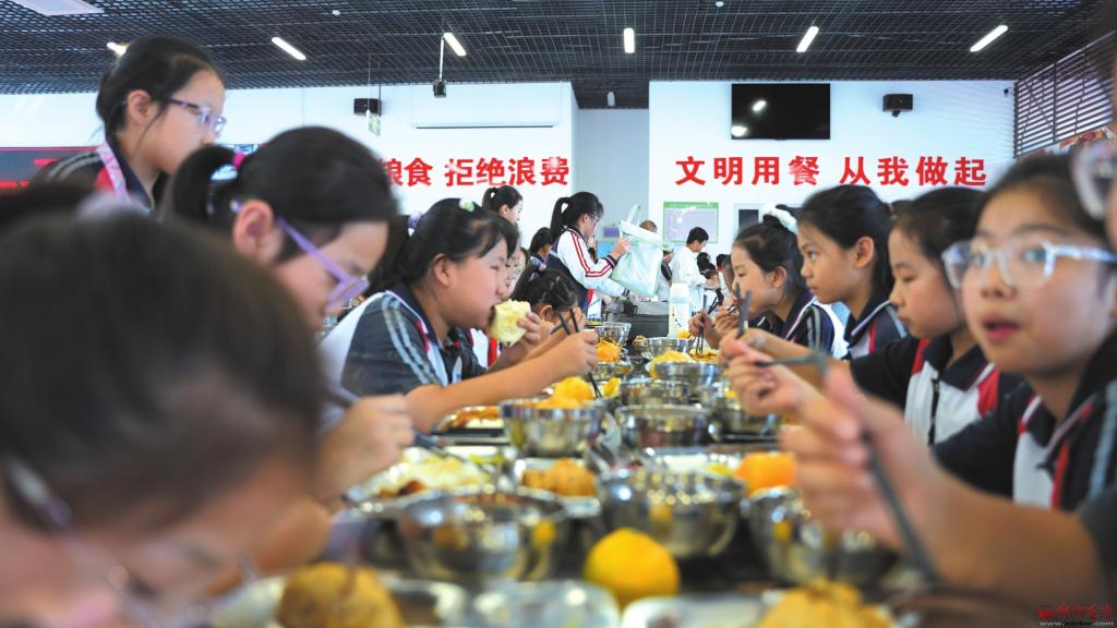 走進長城小學,1535.25平方米的校內(nèi)餐廳里,900余名師生在老師引導下有序取餐、就餐,餐盤里葷素搭配的飯菜色香味俱全,孩子們的臉上滿是笑意?!耙郧鞍謰尮ぷ髅Γ颐刻斓米\噥砘嘏?,現(xiàn)在有了午托太幸福了!午餐每天不重樣,有肉有湯,比媽媽做得還香!”六年級學生李宸慶捧著飯菜笑著說。