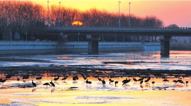 作為國家4A級旅游景區(qū),滹源景區(qū)依托滹沱河生態(tài)資源而建,220萬平方米的區(qū)域內(nèi),“一帶二廊三區(qū)串珠狀”的分布格局,將濕地、河島、蘆葦蕩等多樣生態(tài)景觀有機(jī)串聯(lián)。全長80公里的滹沱河穿境而過,橡膠壩蓄水形成的連片淺灘水質(zhì)澄澈,魚蝦、水生昆蟲等生物資源豐沛,完美契合了黑鸛淺水區(qū)覓食、喜靜避擾的生活習(xí)性,為它們提供了理想的棲息環(huán)境。