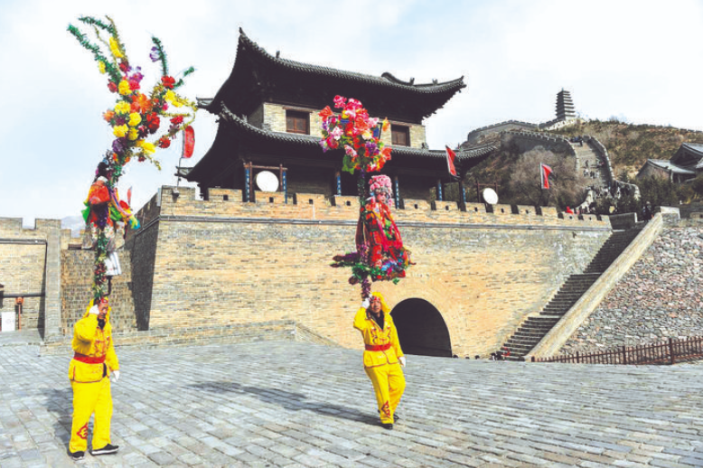 2月23日,在山西省代縣雁門關(guān),郝永俊(左)在進(jìn)行撓閣表演。