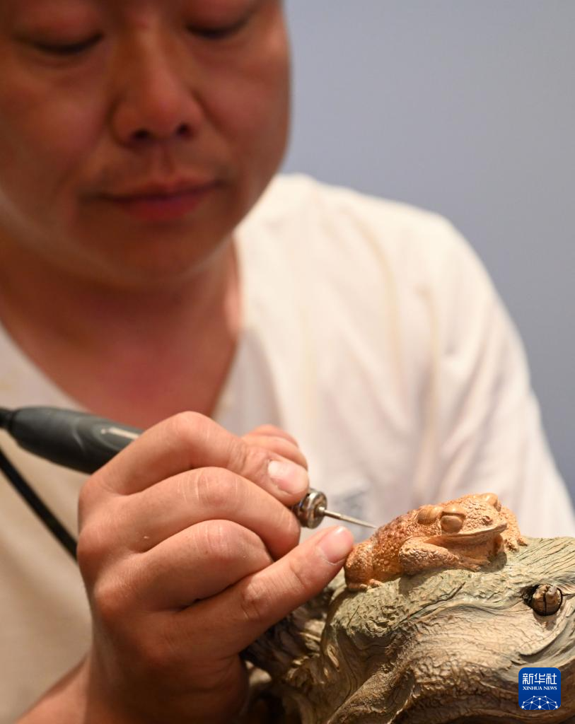 5月16日,民間藝人冀艷利展示根雕技藝。