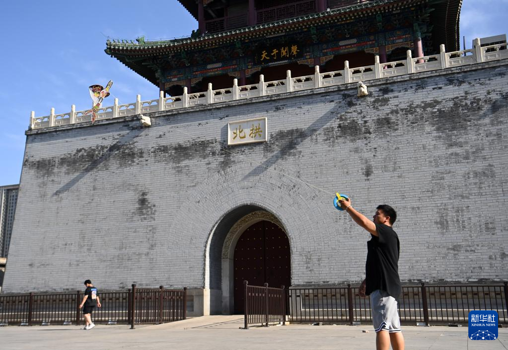 在天津市鼓樓附近,魏博文在放飛一架制作完成的風(fēng)箏(6月8日攝)。