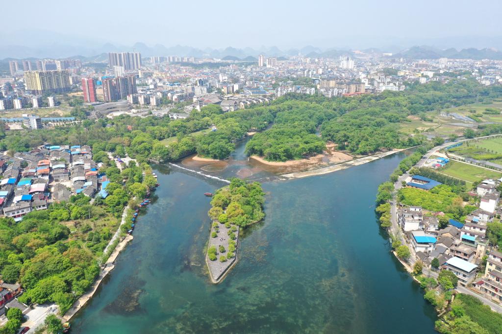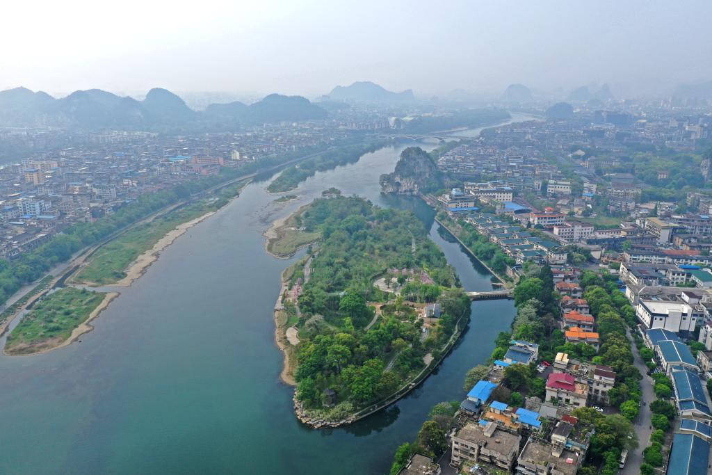 生態(tài)修復(fù)改造后的漓江伏龍洲景色(無(wú)人機(jī)照片)。新華社記者 周華 攝