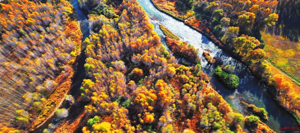 汾河兩岸景色美。圖為記者近日航拍的靜樂汾河川國(guó)家濕地公園秋景。(