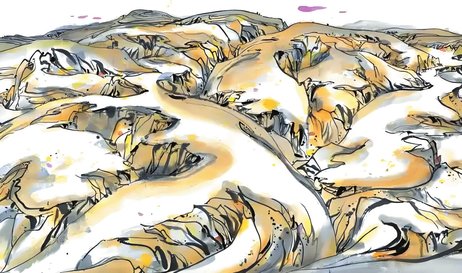 1989年10月的河曲寫生,是吳冠中藝術(shù)生涯的重要轉(zhuǎn)折點(diǎn)。在陪同的學(xué)生王秦生引導(dǎo)下,這位古稀老人尋找“黃土荒漠之典型地區(qū)”,最終駐足晉西北河曲縣。每日晨起,他面對(duì)被雨水沖刷、滿山皆溝壑的地貌,靜心思考,猛然產(chǎn)生了驚人的藝術(shù)聯(lián)想——起伏的山形如同眾多老虎,而那些溝壑恰似老虎皮毛上的斑紋。他在《出現(xiàn)老虎》一文中寫道:“我終于發(fā)現(xiàn)黃土高原是展拓了的老虎之群,其間伏臥著無(wú)數(shù)猛虎,有的正將躍起,有的還在酣睡。作完數(shù)幅黃土高原,意猶未盡,于是我畫起老虎來(lái)?!边@種將地理特征轉(zhuǎn)化為藝術(shù)創(chuàng)作標(biāo)志著吳冠中完成“從風(fēng)景寫生到精神寫意”的蛻變,其價(jià)值在于為現(xiàn)代中國(guó)畫開辟了根植本土、融貫中西的新路徑。一個(gè)月河曲翠峰山寫生之旅誕生的《老虎高原》,更以極富樂感的線條勾勒出這片土地精神的圖騰。