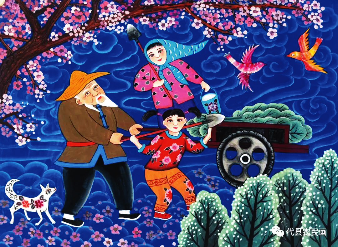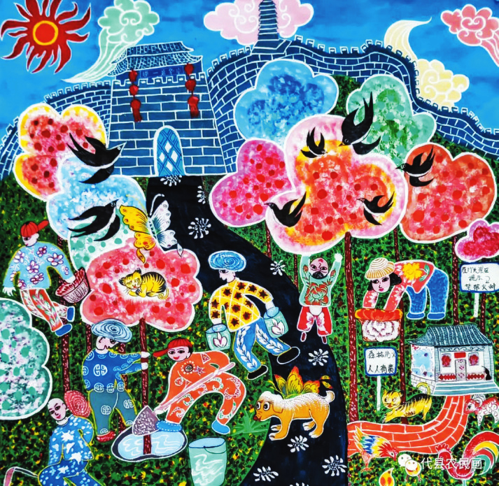 中國歷史文化名城代縣,文化底蘊深厚,民俗傳統(tǒng)技藝精巧別致,1988年和2008年先后被文化部授予“中國民間繪畫畫鄉(xiāng)”“中國民間文化藝術之鄉(xiāng)”。該縣的農(nóng)民畫早在上世紀80年代初就在全國產(chǎn)生過較大影響,之后經(jīng)歷了一段低迷期。近年來在代縣農(nóng)民畫促進會的推動之下,農(nóng)民畫又重新煥發(fā)出耀眼的光彩。先后涌現(xiàn)出多位畫家,其中尤以丁全愛、戴翠平、祁磊、賈永花、郎冬梅等18位女畫家組陣的雁門巾幗,在多年鉆研繪畫技巧的基礎上,創(chuàng)作出一幅幅特色鮮明、獨具匠心的畫作,成為閃耀三晉大地的矩陣,為傳承、弘揚雁門文化做出了新貢獻。