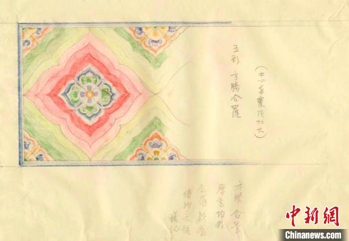 5月27日,“彩畫千年——中國官式彩畫傳承與創(chuàng)新展”在故宮博物院永壽宮展廳正式對(duì)公眾開放。圖為梁思成手繪的宋代五彩方勝合羅(復(fù)制品)。(故宮博物院供圖)