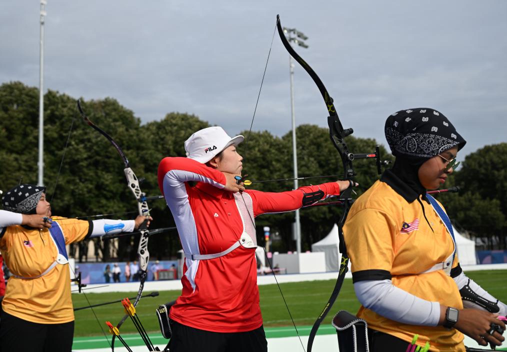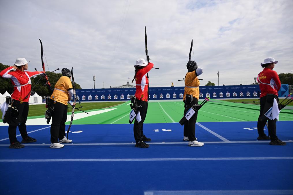 7月25日,巴黎奧運會射箭女子個人排位賽在巴黎榮軍院舉行,中國選手楊曉蕾(中)在比賽中。新華社記者 賀燦鈴 攝