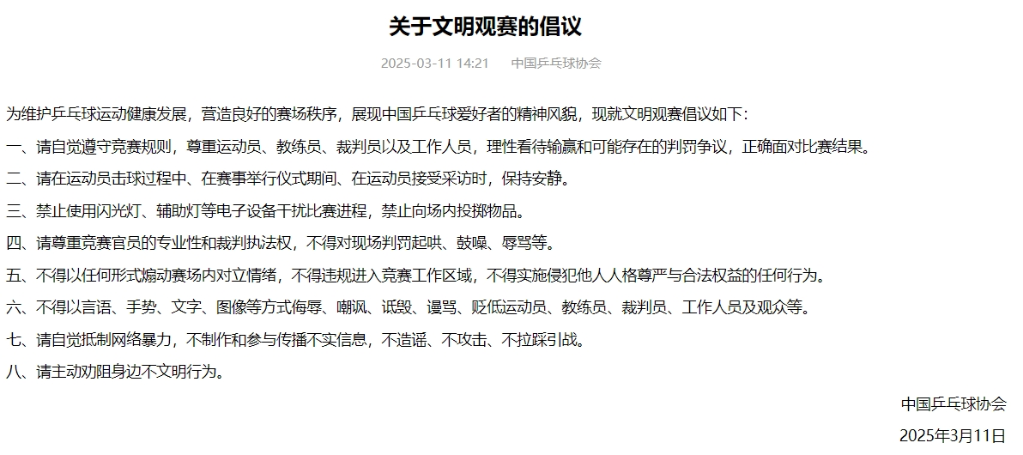 中國(guó)乒協(xié)表示,為維護(hù)乒乓球運(yùn)動(dòng)健康發(fā)展,營(yíng)造良好的賽場(chǎng)秩序,展現(xiàn)中國(guó)乒乓球愛好者的精神風(fēng)貌,特提出文明觀賽的倡議。