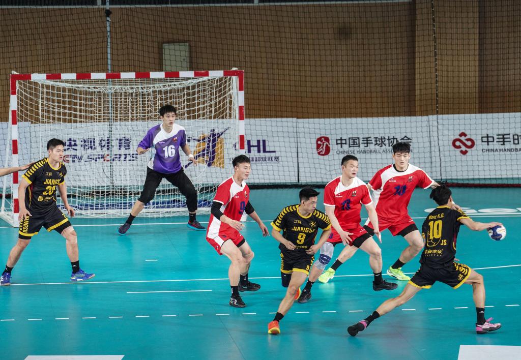 19日,中國(guó)男子手球超級(jí)聯(lián)賽遷安賽區(qū)江蘇隊(duì)(黑)與安徽隊(duì)(紅)在比賽中。