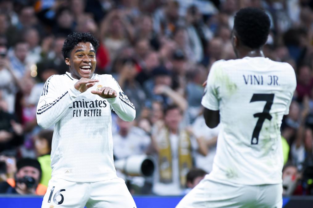 4月1日,皇家馬德里隊球員恩德里克(左)和維尼修斯在比賽中慶祝進(jìn)球。新華社發(fā)(古斯塔沃·巴連特攝)