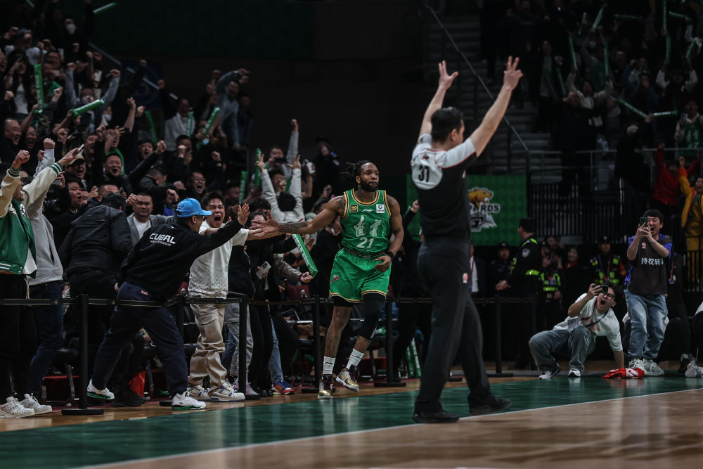 4月13日,遼寧隊球員威爾斯投進絕平三分后慶祝。新華社記者 潘昱龍 攝