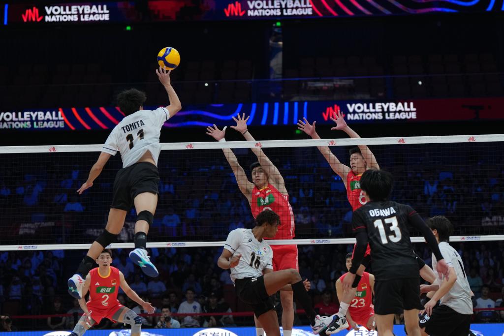 6月11日,中國隊(duì)球員李詠臻(上中)、俞元泰在比賽中攔截日本隊(duì)球員富田將馬(上左)的扣球。新華社記者 李一博 攝