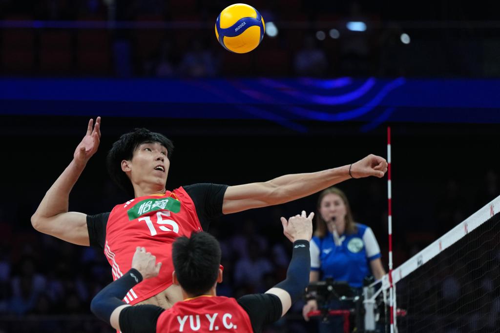 6月11日,中國隊(duì)球員彭世坤在比賽中扣球。新華社記者 李一博 攝