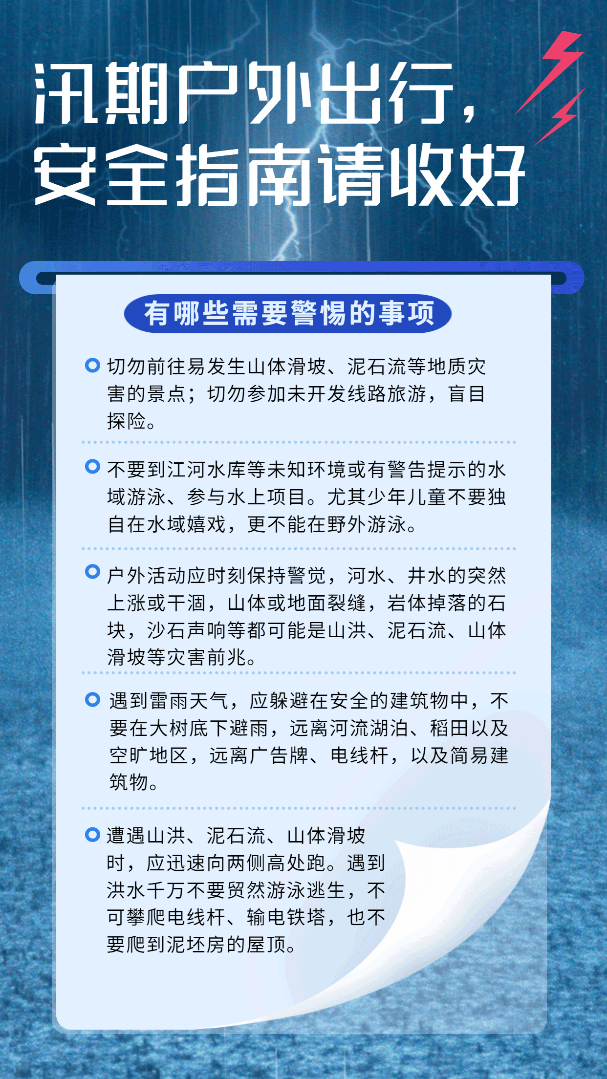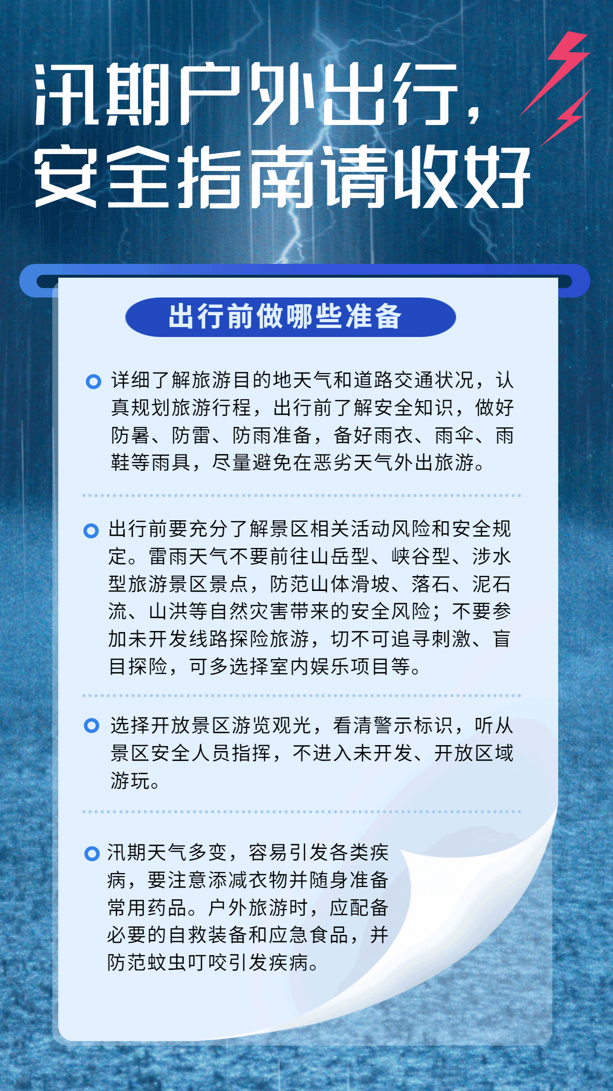 當前正值暑假旅游旺季,也是汛期災(zāi)害事故易發(fā)多發(fā)時期。外出游玩時需要做好哪些安全防范工作?出游時又有哪些需要警惕的事項?一起來了解。