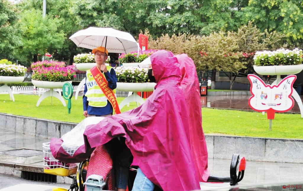 8月31日7點40分,我市城市管理局志愿者早早來到執(zhí)勤崗位,在風(fēng)雨中配合交警在長征街與七一路口維持交通秩序,對橫穿馬路、亂闖紅燈等不文明交通行為進行勸導(dǎo),引導(dǎo)市民遵守交通法規(guī),提高安全意識,用實際行動為創(chuàng)建文明城市做貢獻。曹建華 攝