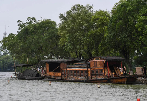 7月1日,嘉興南湖景區(qū)內停泊的中共一大紀念船。新華社記者 徐昱 攝