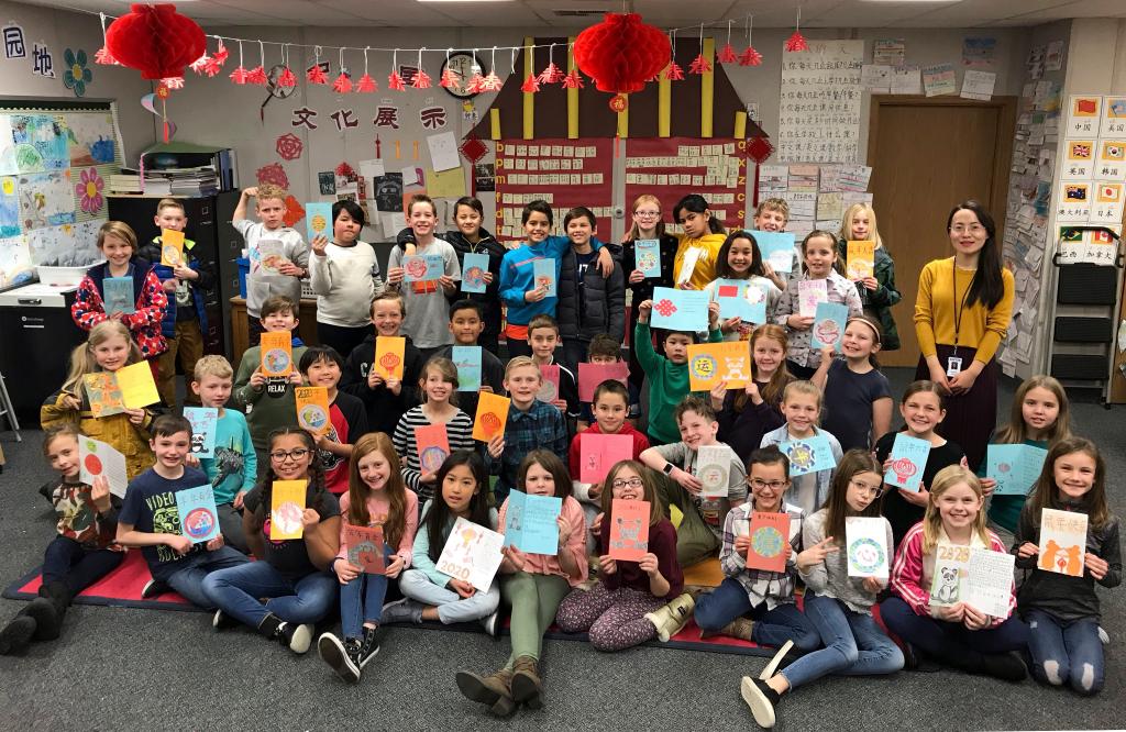 2020年1月21日,在美國猶他州奧勒姆,卡斯卡德小學(xué)師生展示為習(xí)主席制作的新年賀卡。