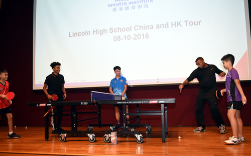 2016年10月8日,香港乒乓球運動員與林肯中學(xué)學(xué)生進(jìn)行交流比賽。當(dāng)日,來自美國華盛頓州塔科馬市林肯中學(xué)的師生到訪香港體育學(xué)院。