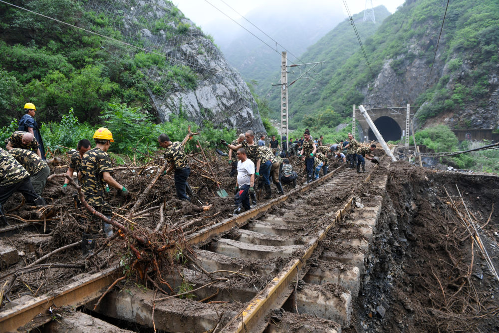 8月1日,在北京市門頭溝區(qū)水峪嘴村附近一段被阻斷的鐵路線上,中鐵六局的工作人員在清理軌道上的雜物,全力恢復交通。新華社記者 鞠煥宗 攝