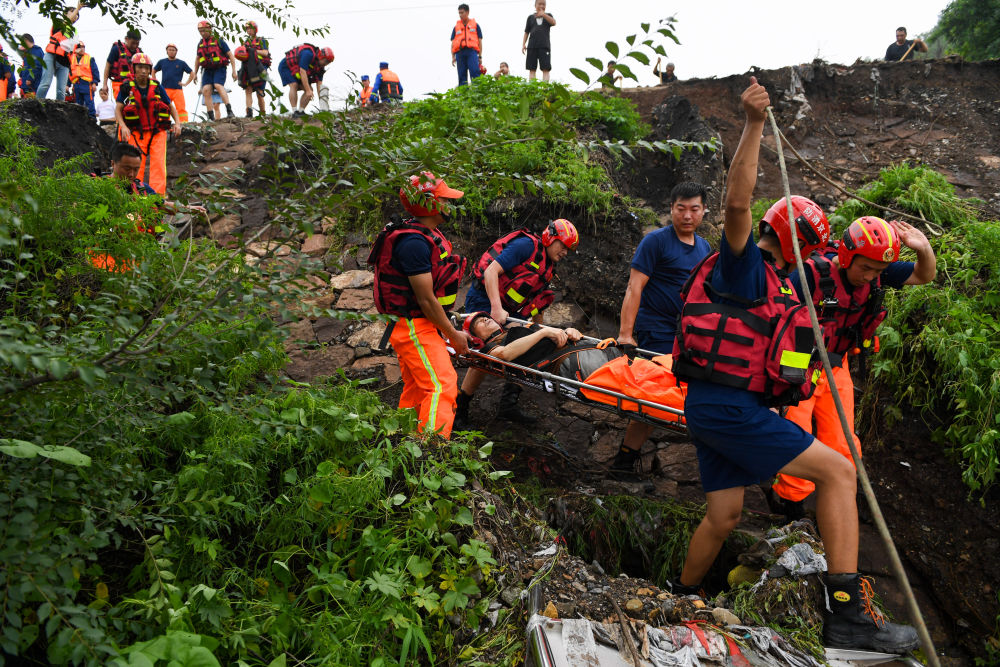 8月1日,在北京市門頭溝區(qū)水峪嘴村,在此增援的大興區(qū)消防救援支隊消防員在轉運被困受傷的村民。新華社記者 鞠煥宗 攝