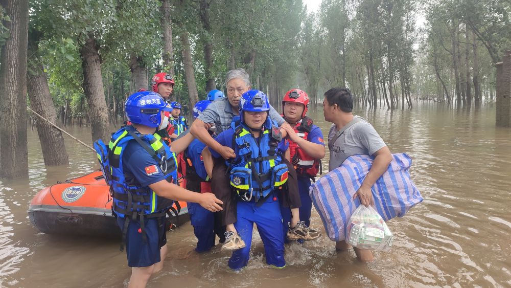 在河北省涿州市汛情重災(zāi)區(qū)碼頭鎮(zhèn)沙窩村,貴州藍(lán)天救援隊(duì)隊(duì)員在轉(zhuǎn)移受困村民(8月4日攝)。新華社發(fā) 汛情就是命令,險(xiǎn)情就是戰(zhàn)情。河北投入大量救援力量趕赴現(xiàn)場(chǎng)應(yīng)急處置,全力以赴抗擊汛情: ——組織封堵涿州城區(qū)西部豁口,延緩洪水進(jìn)城速度; ——調(diào)集龍吸水、排水泵等抽排設(shè)施,加大排水力度; ——各級(jí)應(yīng)急部門對(duì)搶險(xiǎn)救援隊(duì)伍實(shí)行每日“叫應(yīng)”聯(lián)動(dòng),保持備勤狀態(tài),全省出動(dòng)搶險(xiǎn)隊(duì)伍4705支105988人; …… 救援分秒必爭(zhēng)—— “多虧送醫(yī)及時(shí),要不就有生命危險(xiǎn)了。”8月2日19時(shí)許,78歲的河北淶水縣紫石口村村民劉德仲?gòu)目h人民醫(yī)院蘇醒過來(lái),感覺自己闖了回鬼門關(guān)。 劉德仲家在村邊,8月1日被洪水包圍。救援人員腰上拴緊繩子,冒險(xiǎn)下水向著對(duì)面游去,成功拉起一條繩索,用橡皮艇將已經(jīng)接近昏迷的劉德仲救出。 轉(zhuǎn)移翻山越嶺—— “有人來(lái)救我們了!”8月3日,一群被困淶水縣野三坡4天的學(xué)生看到救援人員到來(lái),開心地歡呼起來(lái)。 因暴雨導(dǎo)致路面坍塌、道路受阻,一所學(xué)校45名師生被困野三坡萬(wàn)鑫酒店,一同被困的還有該酒店15名工作人員。保定市淶水縣消防救援大隊(duì)6名消防員冒著危險(xiǎn),經(jīng)過3個(gè)多小時(shí)的跋涉,最終將被困人員轉(zhuǎn)移到安全區(qū)域。 (二) 在各級(jí)努力下,受災(zāi)群眾正在得到妥善安置。
