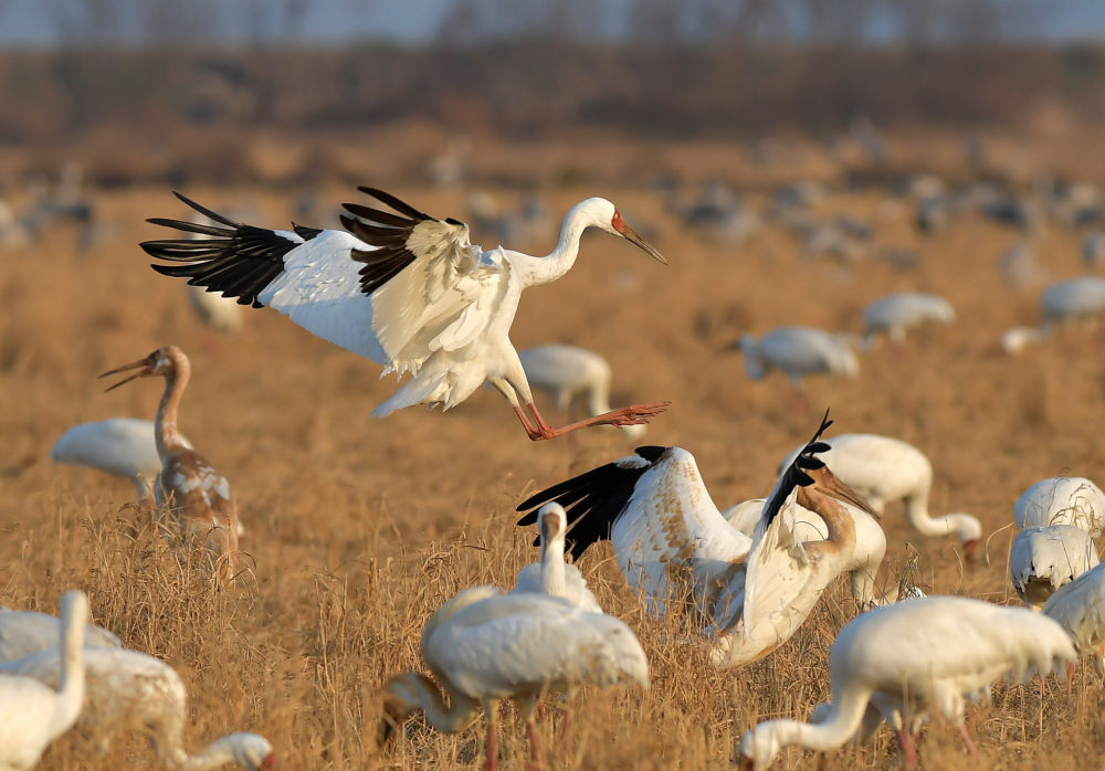 這是2021年1月15日在鄱陽湖畔的江西余干縣康山墾殖場(chǎng)插旗洲拍攝的白鶴。隨著長(zhǎng)江重點(diǎn)水域生態(tài)修復(fù)措施的落實(shí),鄱陽湖環(huán)境正發(fā)生嬗變。江西鄱陽湖國(guó)家級(jí)自然保護(hù)區(qū)管理局2022年新年伊始發(fā)布的鄱陽湖區(qū)最新鳥情數(shù)據(jù)顯示,工作人員在野外監(jiān)測(cè)統(tǒng)計(jì)到水鳥76.6萬余只,創(chuàng)有監(jiān)測(cè)記錄以來新高。