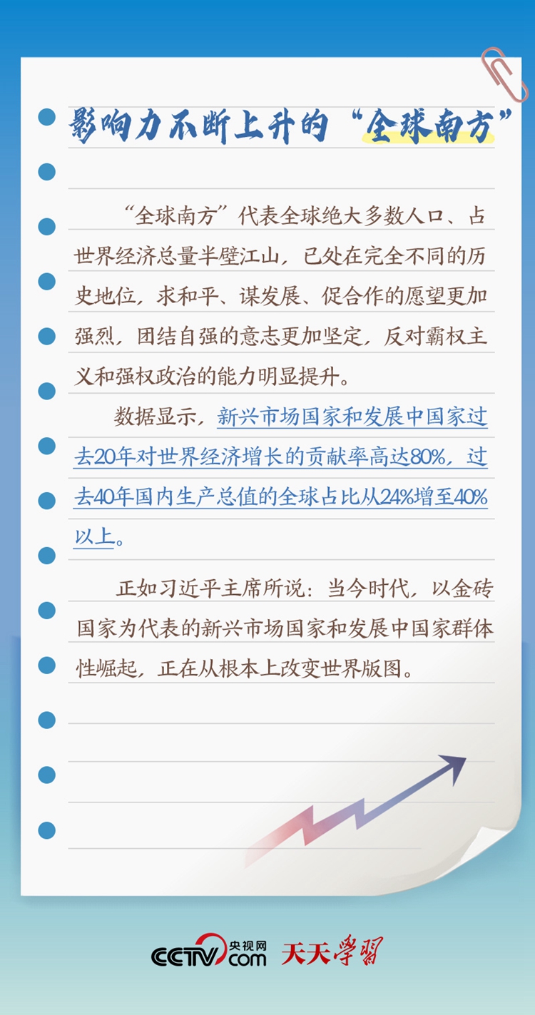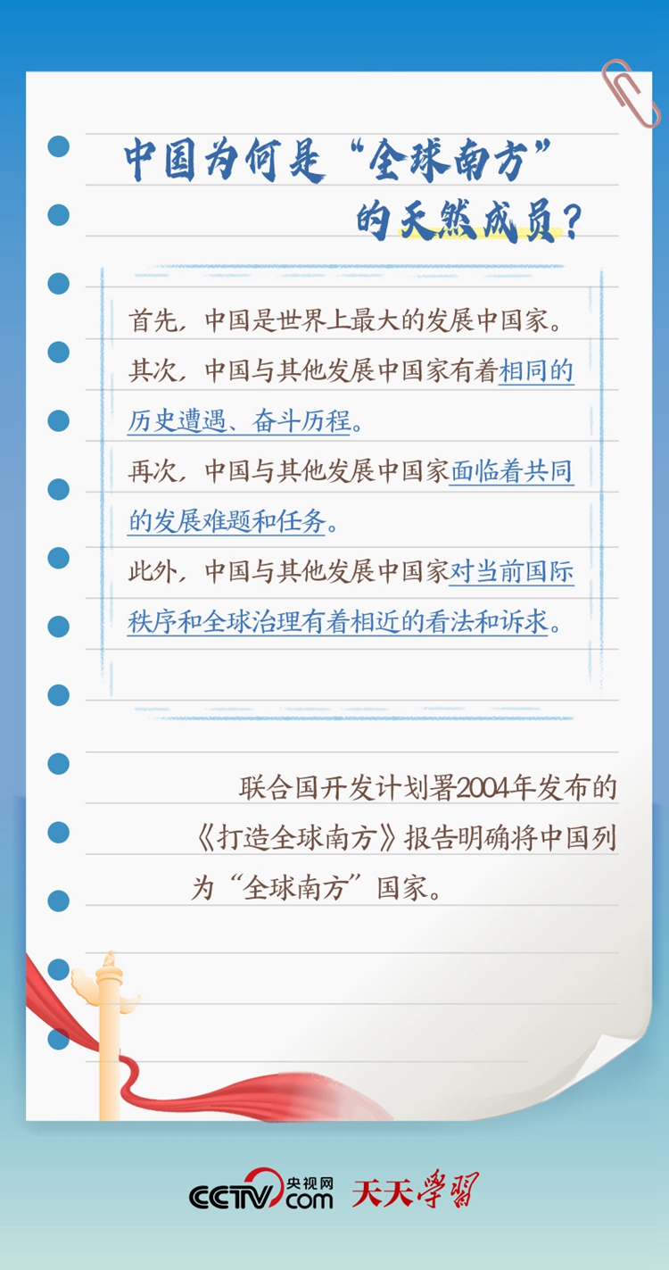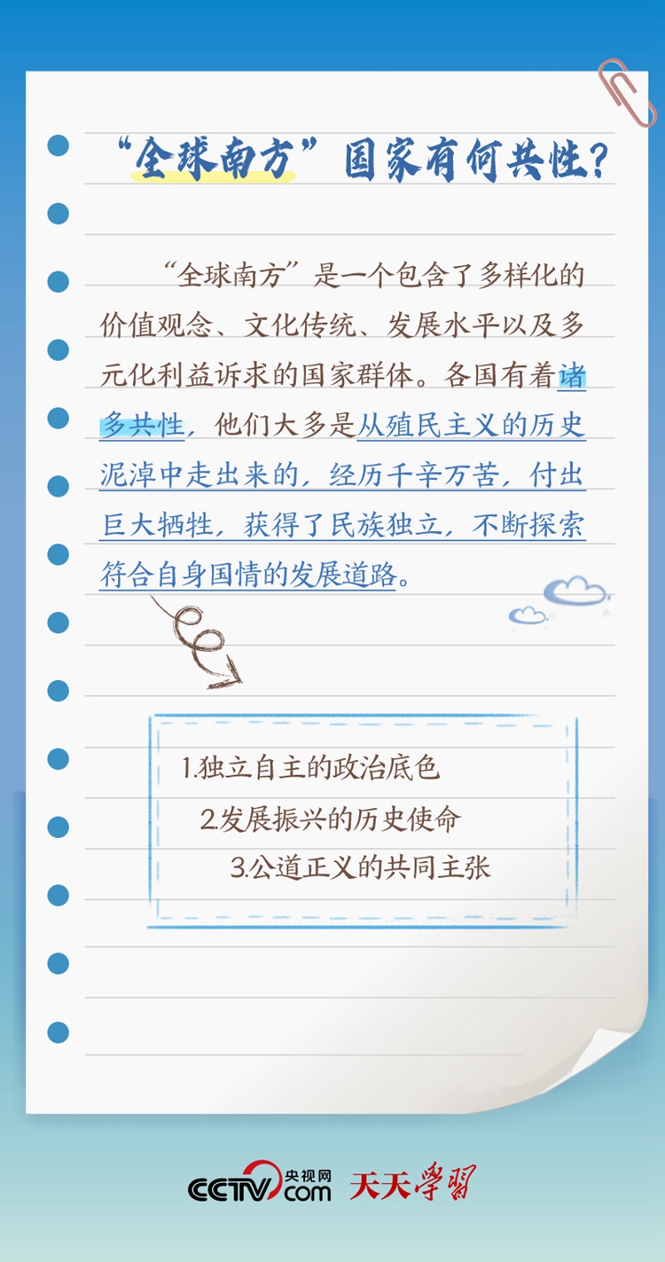 天天學習“作為發(fā)展中國家、‘全球南方’的一員,中國始終同其他發(fā)展中國家同呼吸、共命運”;“中南作為‘全球南方’天然成員,更要團結一致,共同呼吁擴大發(fā)展中國家在國際事務中的話語權和影響力”;“提升‘全球南方’國家在全球治理中的代表性和發(fā)言權”。 此次出訪,習近平主席在向約翰內(nèi)斯堡金磚國家工商論壇閉幕式發(fā)表致辭、同南非總統(tǒng)拉馬福薩共同會見記者等場合均提及“全球南方”。什么是“全球南方”?“全球南方”國家有何共性?中國為何是“全球南方”的天然成員?跟著央視網(wǎng)《天天學習》一起了解。
