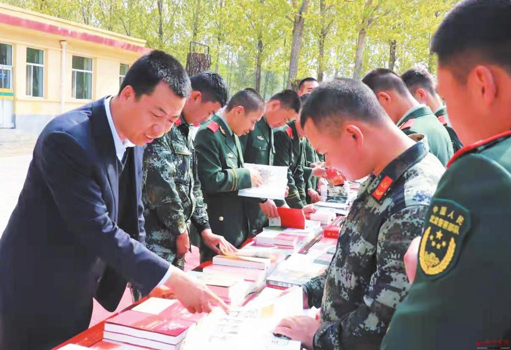 為豐富駐忻武警官兵的文化生活,近日,市新華書店開展了“送書進軍營”活動,給武警官兵帶去了豐富的精神食糧。(張存良 攝)