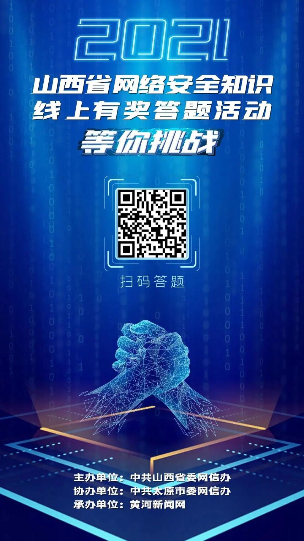 為深入宣傳貫徹《中華人民共和國網(wǎng)絡(luò)安全法》等相關(guān)法律法規(guī),進(jìn)一步普及網(wǎng)絡(luò)安全知識(shí),提升全社會(huì)網(wǎng)絡(luò)安全意識(shí)和防護(hù)技能,在2021年國家網(wǎng)絡(luò)安全宣傳周期間,由中共山西省委網(wǎng)信辦主辦、中共太原市委網(wǎng)信辦協(xié)辦、黃河新聞網(wǎng)承辦的“2021山西省網(wǎng)絡(luò)安全知識(shí)線上有獎(jiǎng)答題活動(dòng)”于10月9日正式啟動(dòng)。