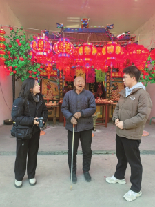 呂梁記者站記者要佳(左)、秦嘉良(右)在柳林縣穆村鎮(zhèn)沙曲村采訪國家級非物質(zhì)文化遺產(chǎn)代表性項(xiàng)目——盤子會。