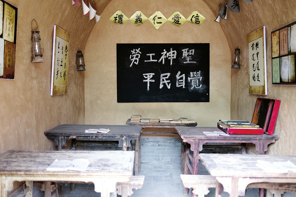 推開(kāi)堆云洞一層側(cè)院展廳木門,明媚的陽(yáng)光照進(jìn)教室,黑板上“勞工神圣平民自覺(jué)”8個(gè)粉筆字赫然在目,老舊的桌椅、殘留的坑道、銹跡斑斑的馬燈,雖已被時(shí)間抹去了原有的模樣,但仍時(shí)刻警醒著后人勿忘國(guó)恥。